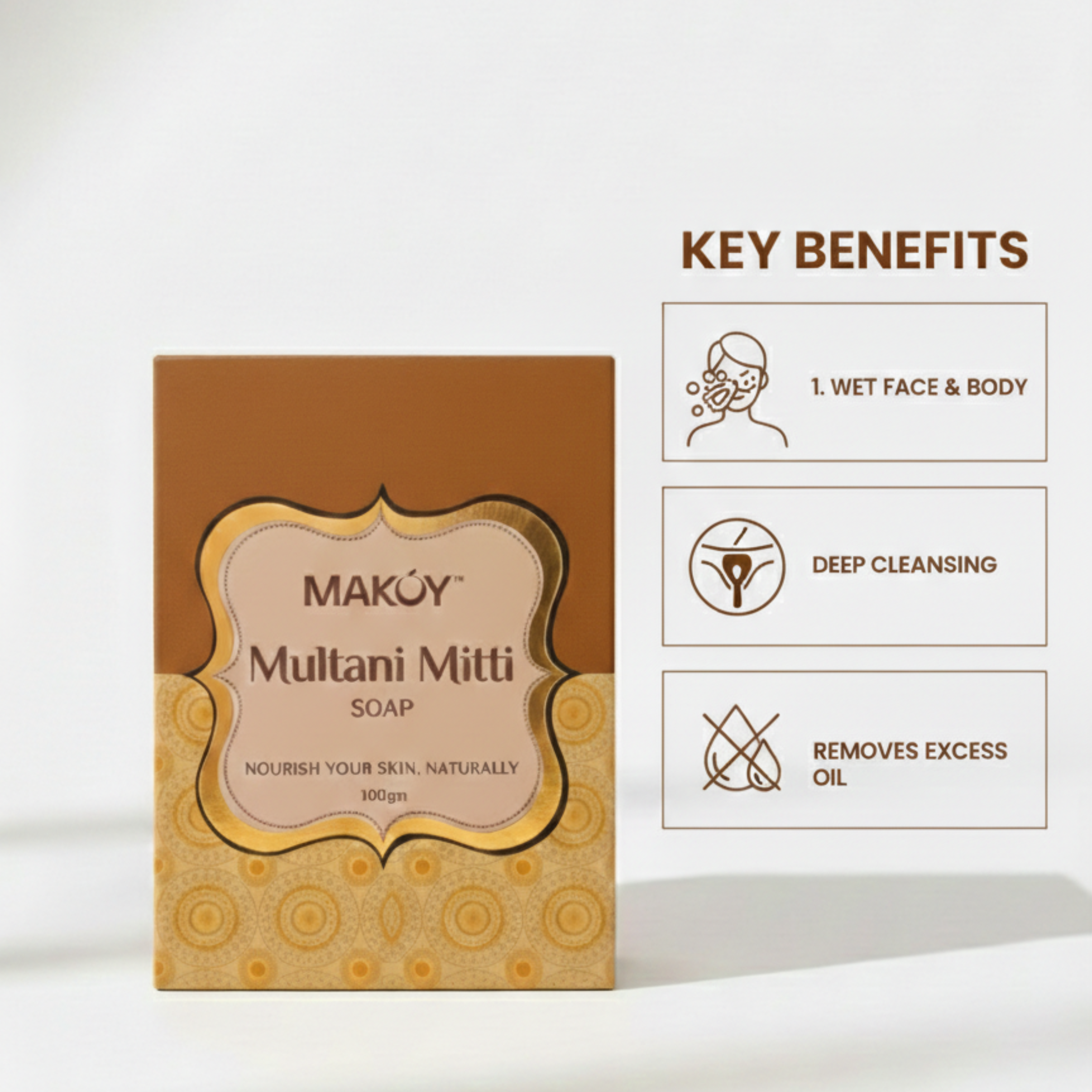 Cleanse and refresh your skin with MAKOY Multani Mitti Soap Pack of 6. This value pack with a total weight of 600 GM deeply cleanses pores, controls excess oil, and removes dirt and impurities, helping keep your skin fresh, clear, and naturally glowing with regular use.